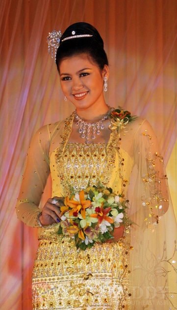 Myanmar models present weddingdress during a wedding birdal show at Park Royal hotel on Sunday, Aug.19, 2012, in Yangon, Myanmar.