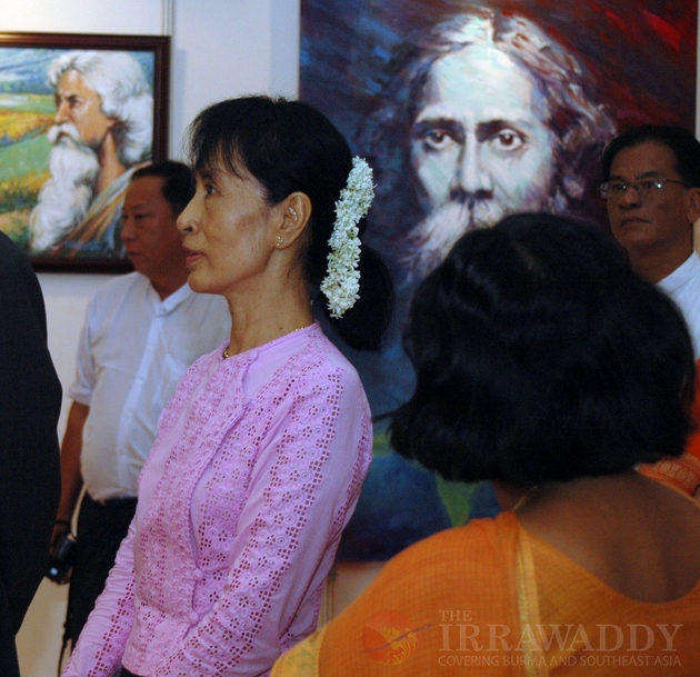 Myanmar democracy icon Aung San Suu Kyi browses paintings of Myanmar artists during her visit to arts exhibition participated by Myanmar artists to mark the 150th birth anniversary celebrations of Rabindranath Tagore at Indian Embassy Monday, Sept. 5, 201