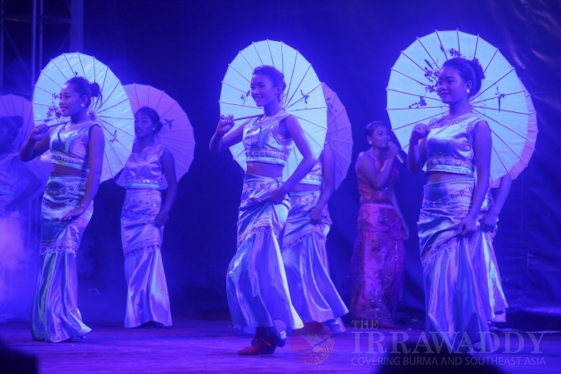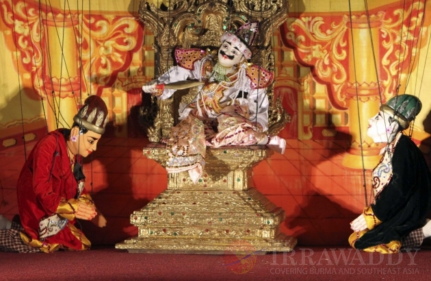 A Burma traditional artist troupe performs during their puppet show in Rangoon, Burma.