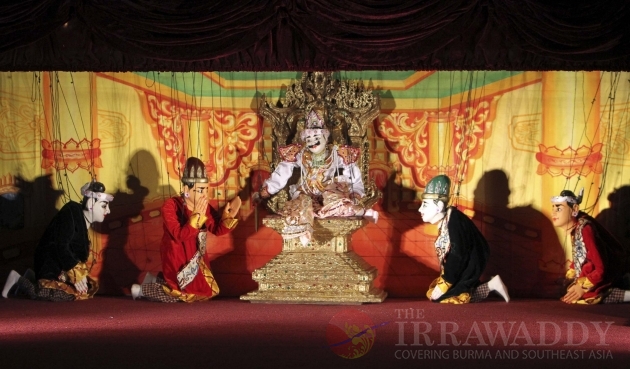 A Burma traditional artist troupe performs during their puppet show in Rangoon, Burma.