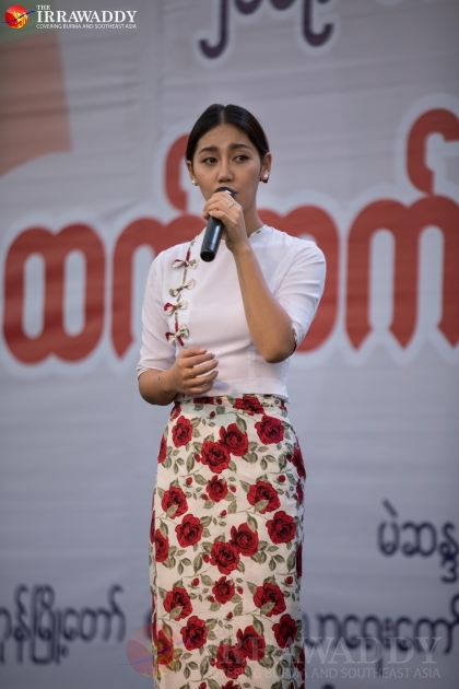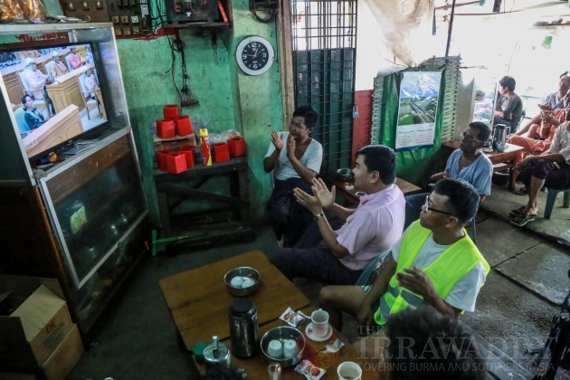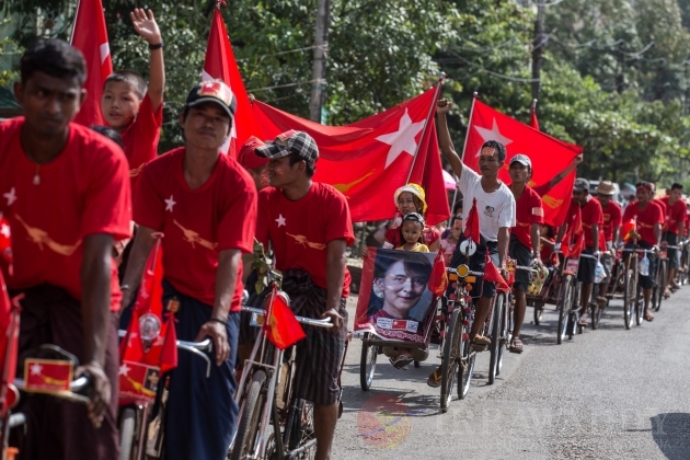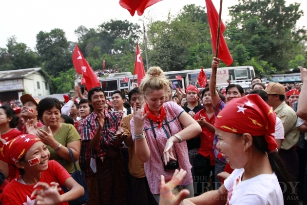Supporters full of happiness for the victory of NLD in the Apr 1 by-election, 2 Apr 2012, Yangon, Myanmar.