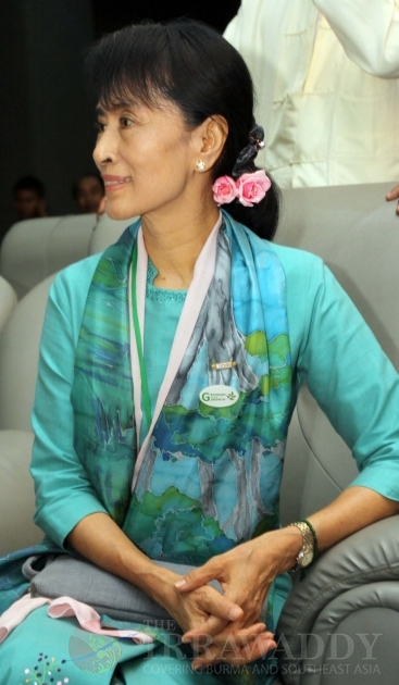 Myanmar democracy icon Aung San Suu Kyi, second left, arrives to attend the Conference on Green Economy and Green Growth at Myanmar Banks Association Hall in Yangon, Myanmar, Friday, Nov. 4, 2011. Others in the photo are unidentified.