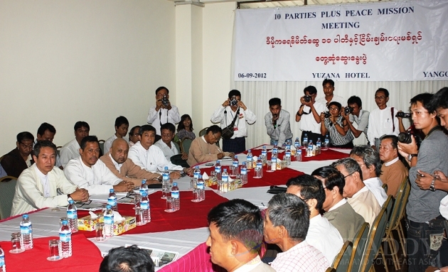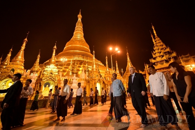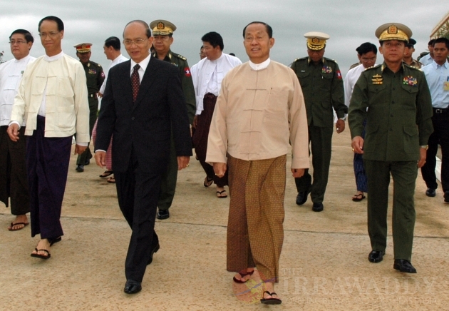 Burma president Thein Sein being welcome back by Burma two vicde presidents at Naypyitaw Airport, Burma.