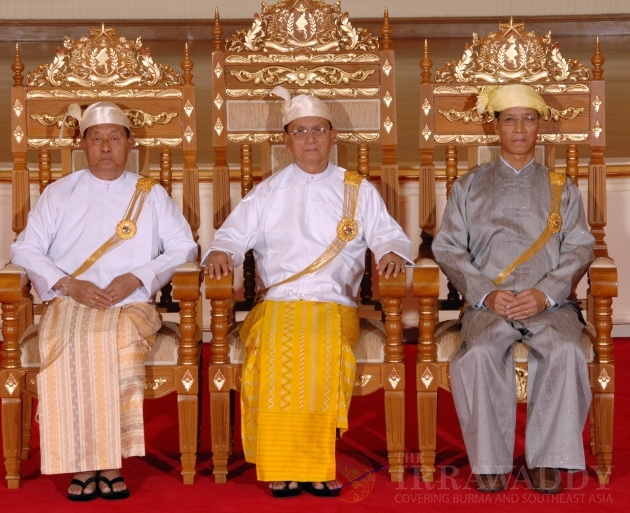Burma President Thein Sein (Centre), Vice President Thiha Thura Tin Aung Myint Oo (Left) and Vice President Sai Mauk Khan (a) Maung Ohn sit on chairs as they pose for photo at the parliament in Naypyidaw, Burma.