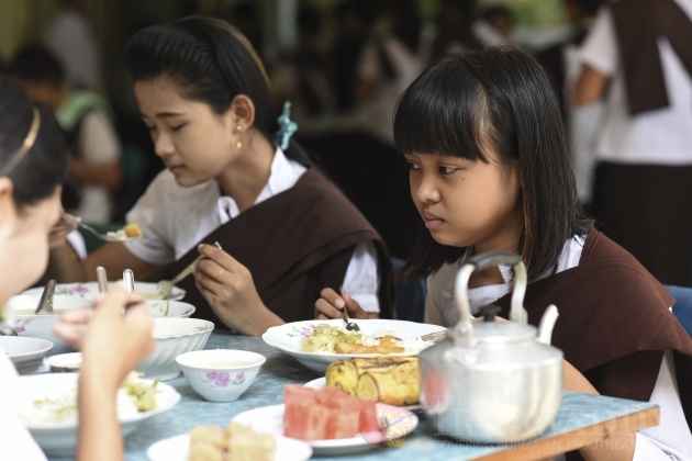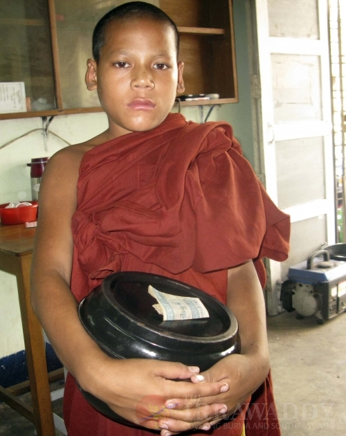 Young novice collecting alms at the coffee shop in Rangoon, Burma.