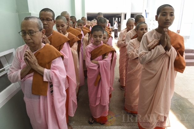 Novices walk through the road while asking for alms in Rangoon, Burma.